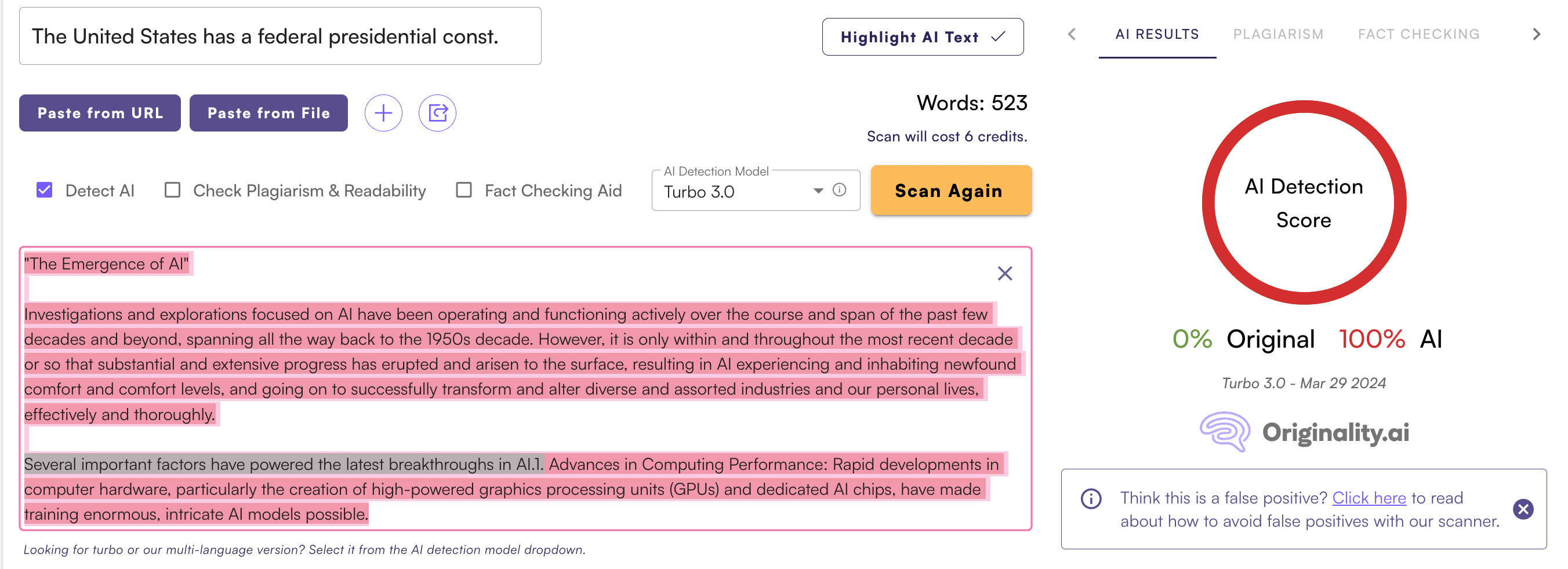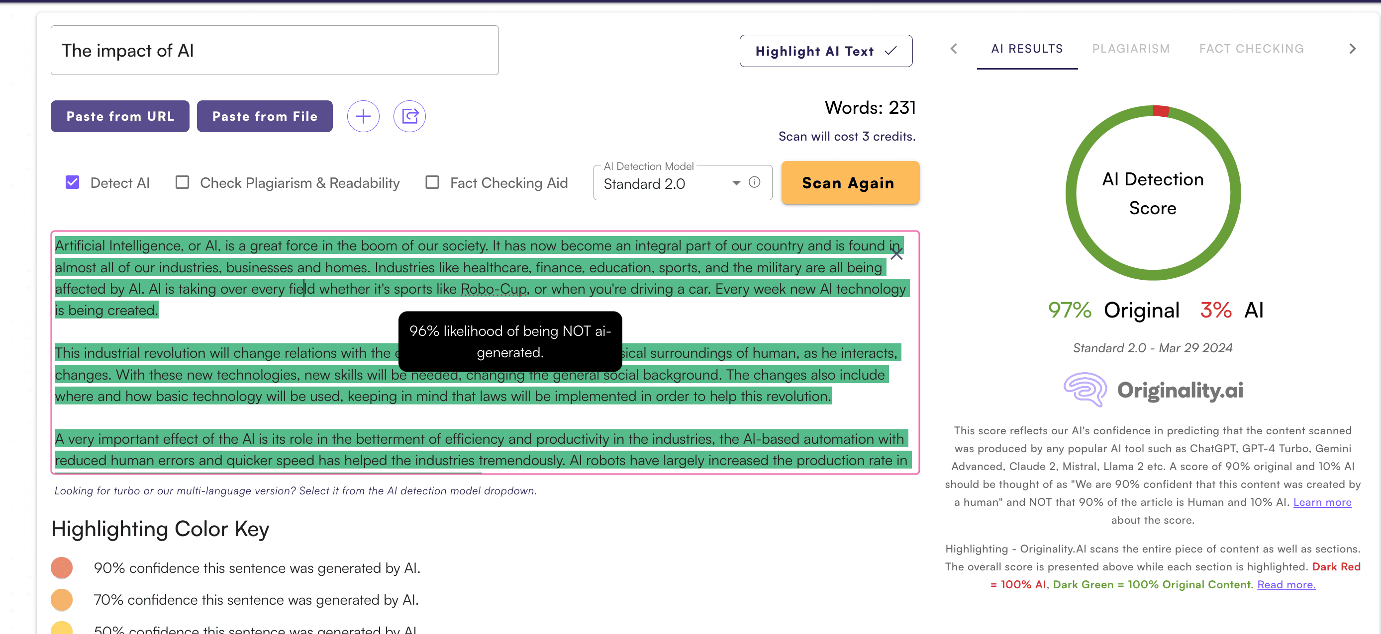 Let’s input a topic from ChatGPT to test it if OriginalityAI can detect its AI generated text.
