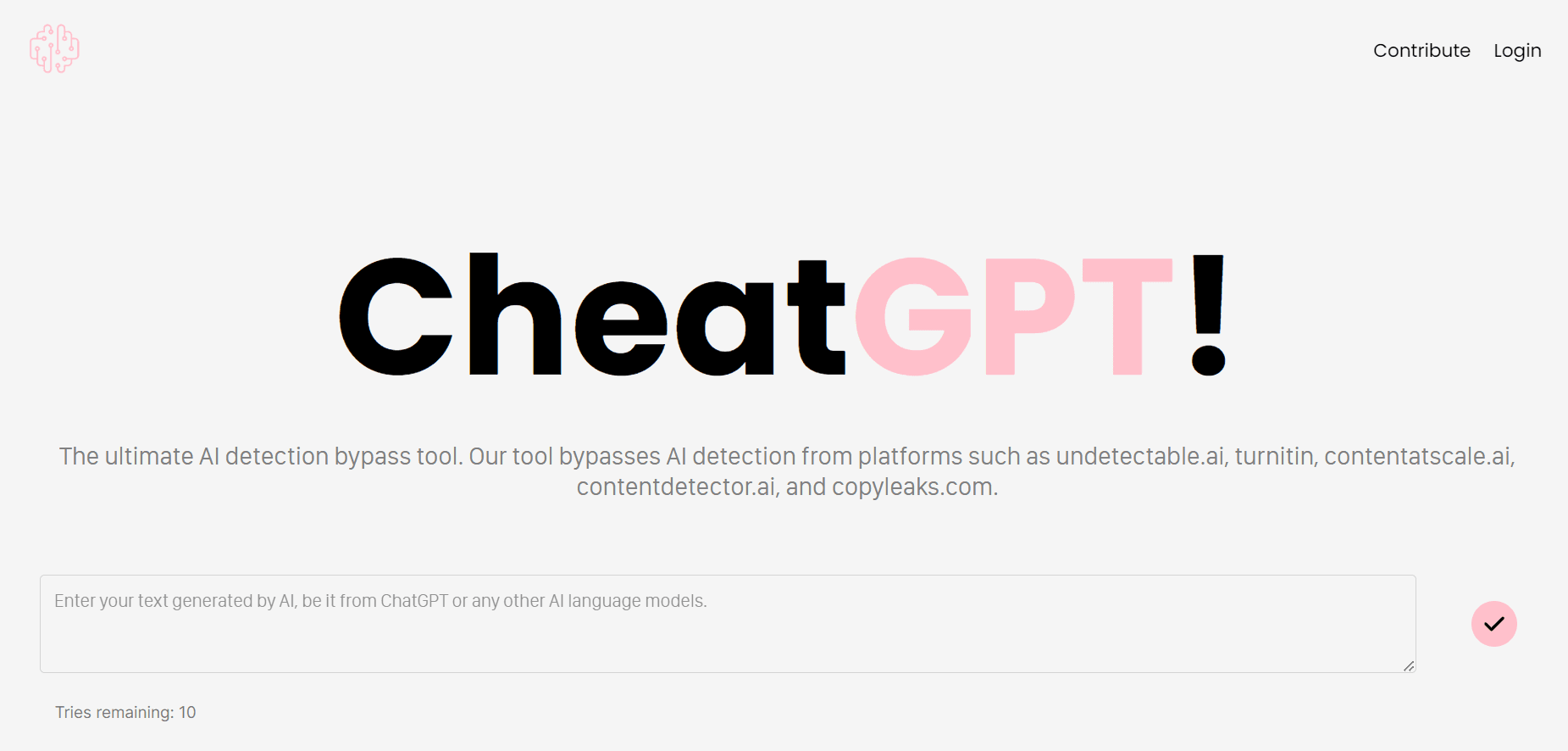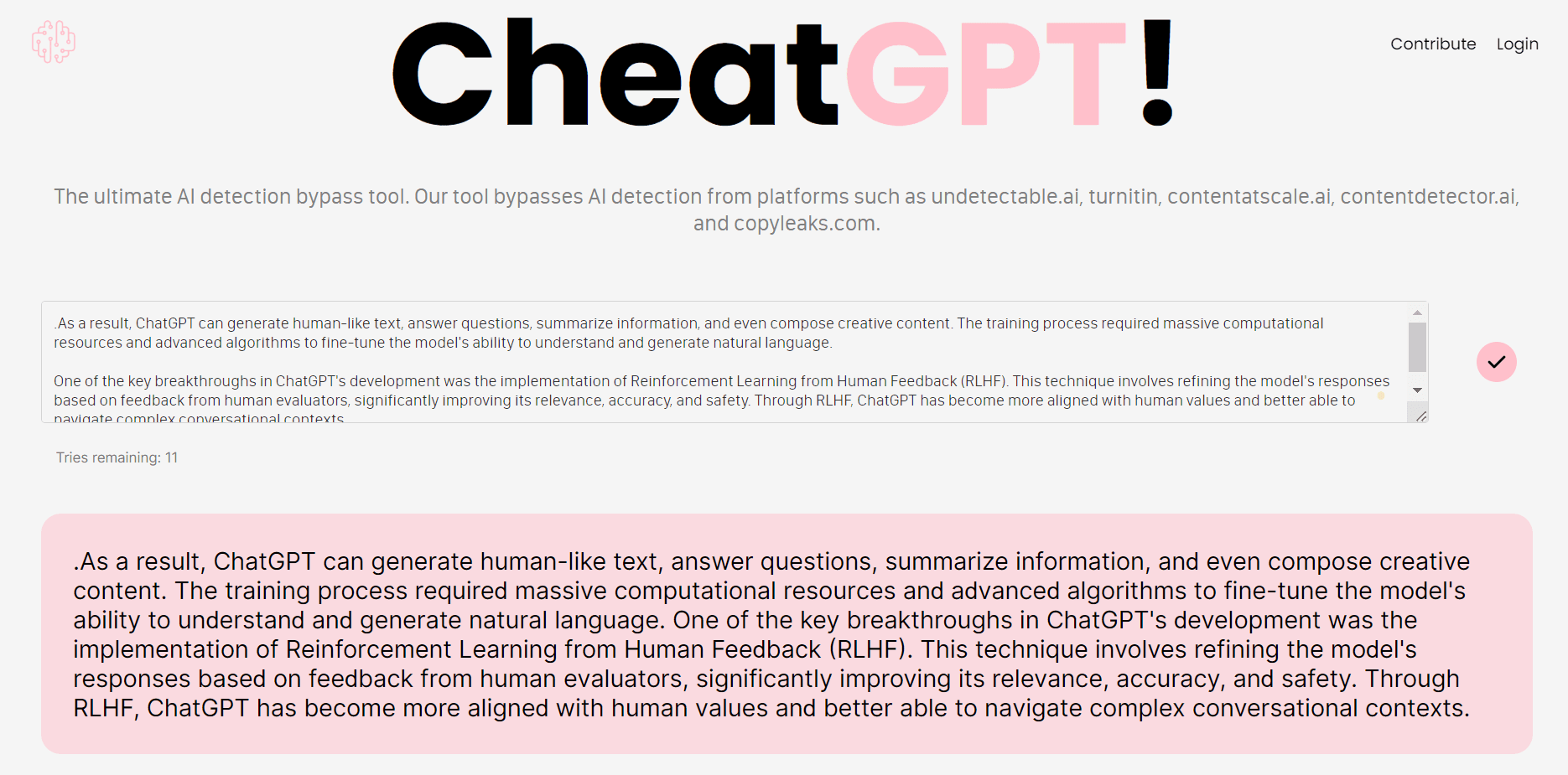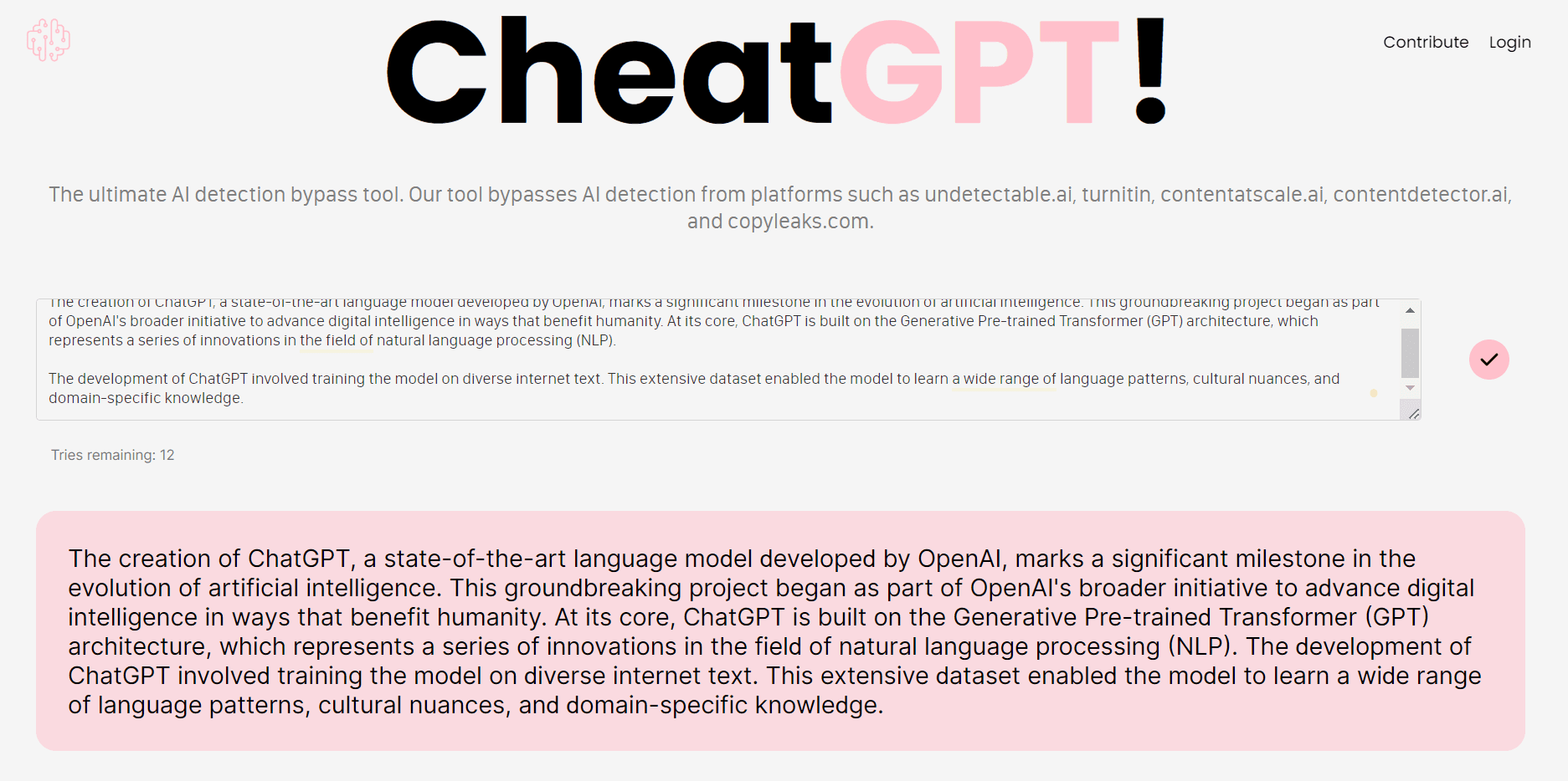 CheatGPT is a tool designed to adapt AI-generated content in a manner that makes it difficult for an AI detection system to identify its origins. This innovation is primarily targeted at users who wish to present AI-generated text as if it were human-written, without triggering flags from detection tools such as those used in academic settings or content publishing platforms. The essence of CheatGPT lies in its ability to subtly modify the generated content, altering its phrasing, structure, and stylistic elements to closely mimic human writing patterns. This capability ensures that the content bypasses the scrutiny of AI detection technologies, thereby assisting students, researchers, and content creators in maintaining the appearance of originality and authenticity in their work, even when leveraging the efficiency and creativity of AI writing tools.