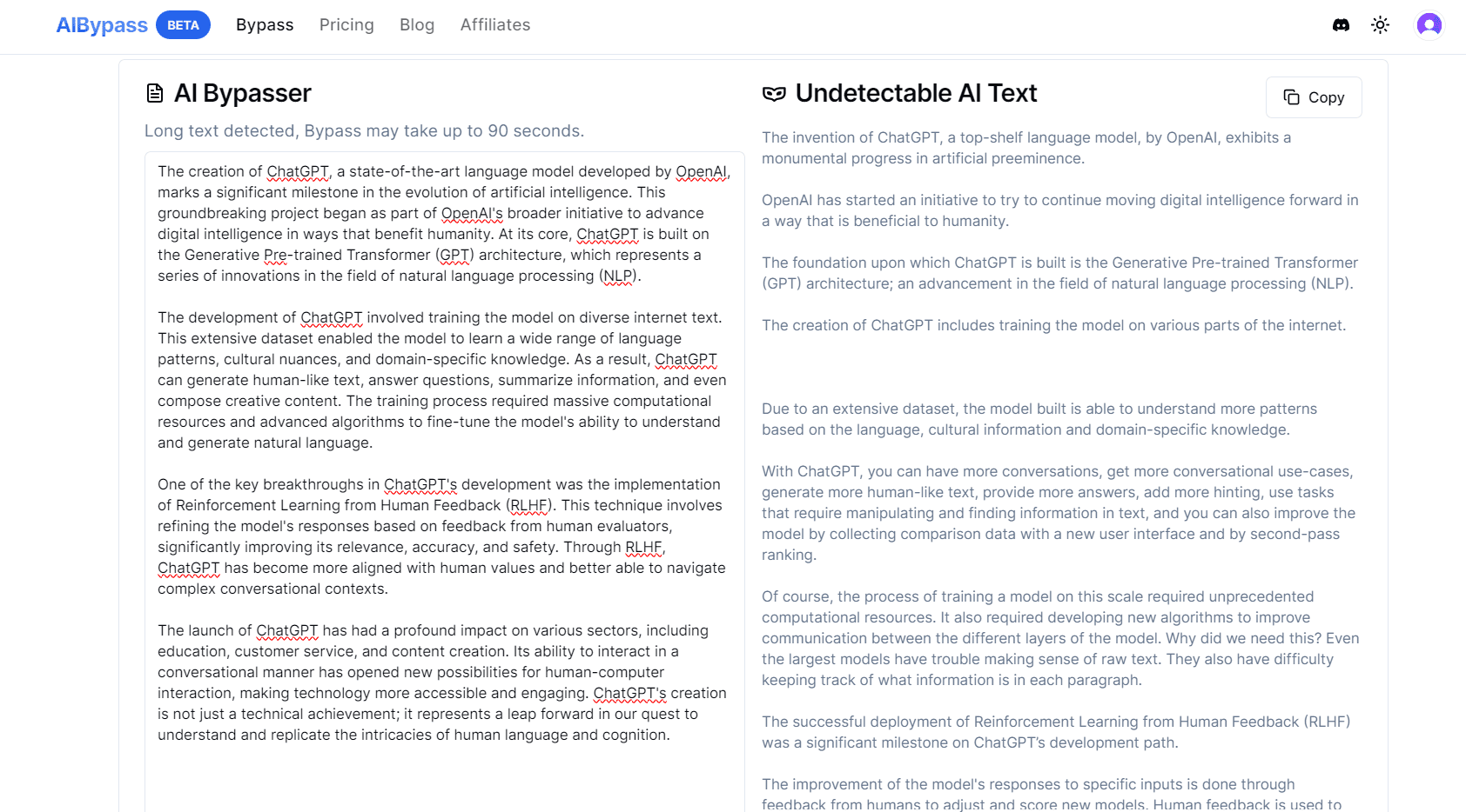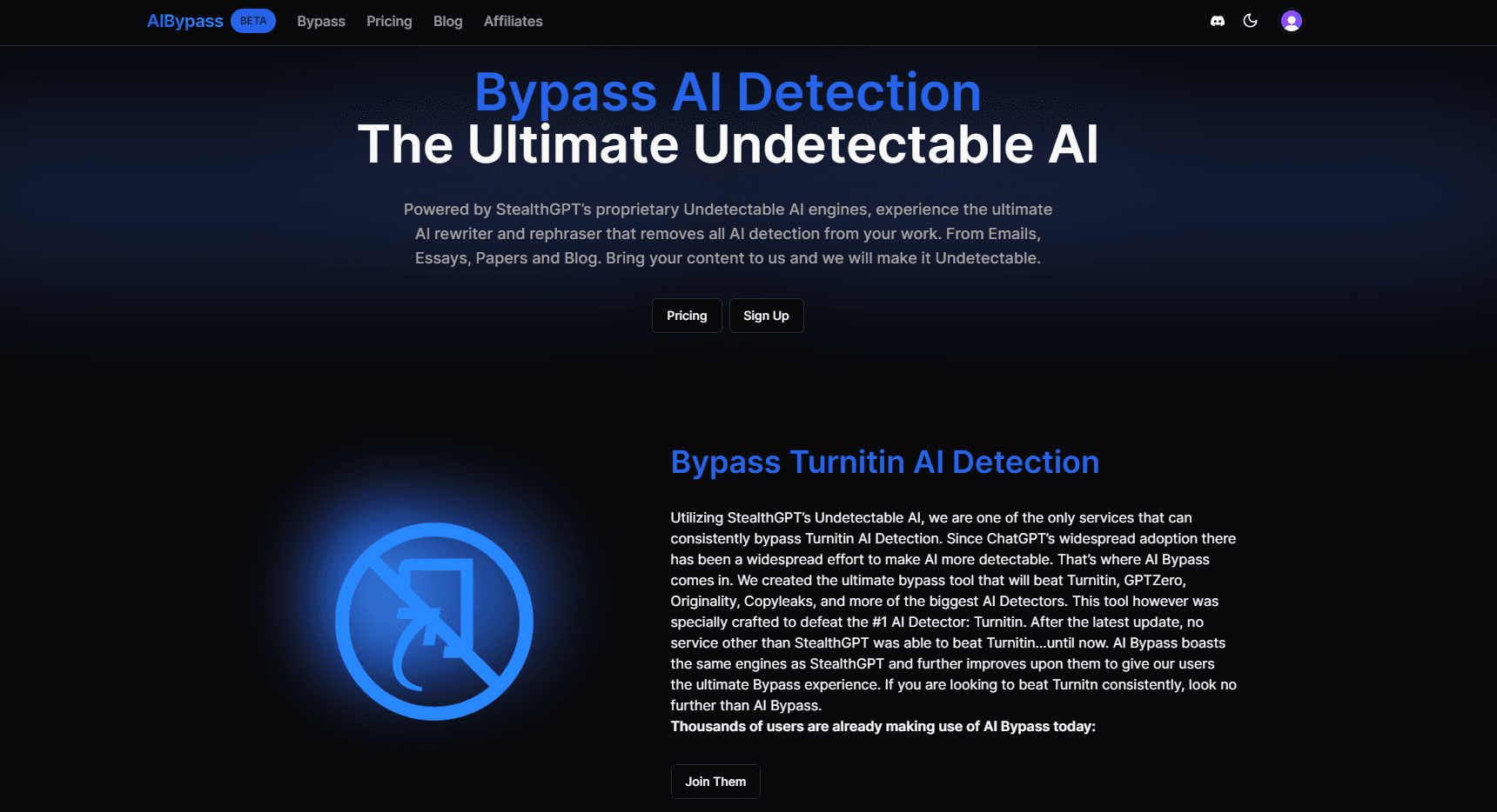 AIBypass stands as a groundbreaking platform crafted to alter AI-generated content so that it mirrors the authenticity typically associated with human-written works, seamlessly navigating around AI detection systems such as Turnitin, GPTZero, and more. Its core aim is to support content creators, people in academics, and students in preserving the originality and uniqueness vital for adherence to academic and professional norms, avoiding the label of AI-generated material. In response to the escalating issue of AI content detectability, AIBypass positions itself as an indispensable resource for upholding the credibility and genuineness of textual creations in settings where distinguishing between human authors is crucial.At the heart of AIBypass’s functionality are the StealthGPT’s undetectable AI engines, intricate mechanisms that employ cutting-edge machine learning and natural processing technologies. These engines scrutinize and adapt AI-generated content’s structure, tone, and stylistic elements, implementing adjustments to replicate the human touch, including rewording, sentence reformation, and modifying the content flow to mirror human writing patterns more closely. The standout feature, the Undetectable AI Humanizer, significantly elevates the material’s authenticity, making it virtually undetectable by prominent AI detection systems. Thanks to ongoing enhancements and learning from an extensive range of texts, AIBypass’s capabilities continually advance, effectively countering detection tools and ensuring the seamless presentation of AI-produced content as human-crafted.