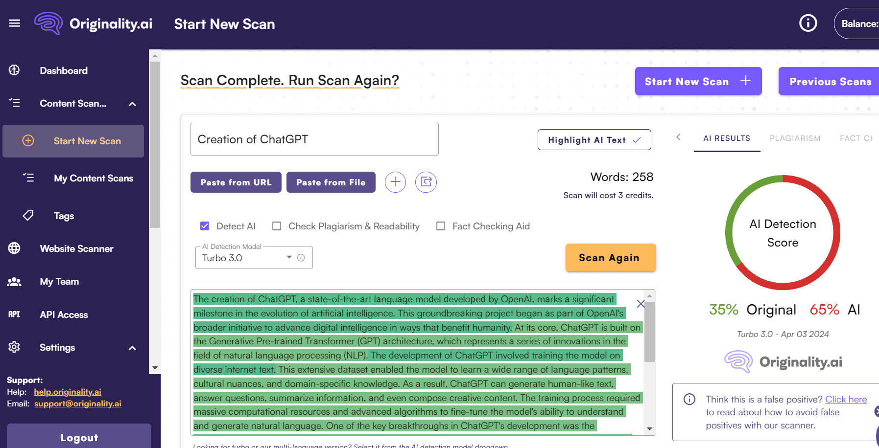 Following this refinement by CheatGPT, we will now evaluate how Originality AI assesses the altered content.