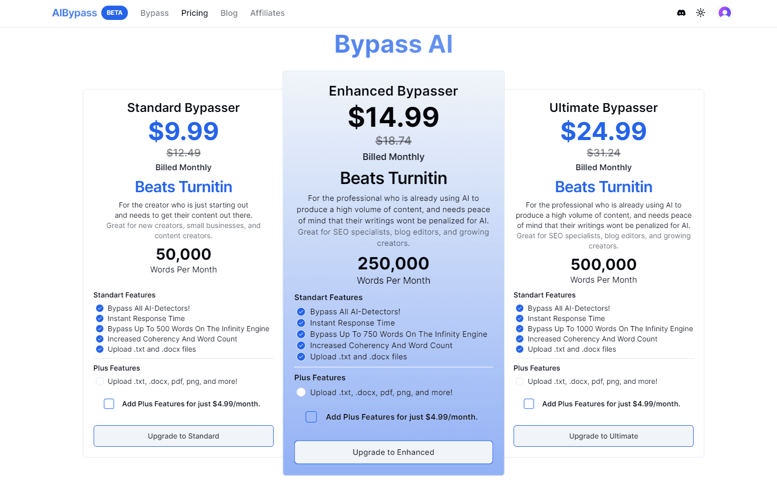 AIBypass introduces its pricing with an appealing option for users: the Standard Bypasser, now available at $9.99, offers a generous allowance of 50,000 words per month. This package, only $4.99 more than CheatGPT’s $5 plan, represents a value proposition for those seeking a more advanced tool. The additional cost grants access to AIBypass’s enhanced capabilities, notably its increased coherency in generating AI content that closely mimics human writing. This pricing strategy not only makes AIBypass an attractive alternative to users but also highlights its effectiveness and superior performance in the realm of AI-generated content creation, offering significant benefits for a modest increase in investment.