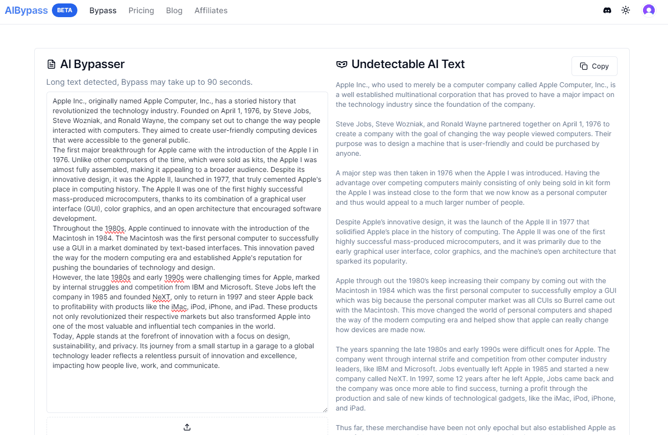 Discover AIBypass, an intriguing newcomer that markets itself as an AI platform specifically crafted to evade plagiarism detection systems effortlessly. At its essence, AIBypass is a groundbreaking AI rewriting and rephrasing tool, utilizing the advanced Undetectable AI engines developed by StealthGPT. It aims to remove all signs of AI detection in diverse forms of written material, including emails, essays, papers, and blog posts. AIBypass's mission is to enable users to showcase their content freely, without the constraints of AI detection, offering a novel approach to content generation.Understanding the advantages of AIBypass requires a deep dive into its functioning, examining its capacity to foster a beneficial transformation in academic writing practices. This investigation encourages reflection on the ethical considerations of these technologies, questioning their role in improving academic honesty and transforming the application of technology in educational settings.In this blog, we're going to take an in-depth look at QuillBot, exploring its features and assessing its effectiveness in evading detection by Originality AI. Additionally, we'll apply the same rigorous examination to AIBypass, evaluating its performance and verifying the accuracy of its claims. Does it have the unique ability to slip past detection more adeptly than similar tools? Join us as we scrutinize these tools to understand their capabilities and impact on academic integrity.