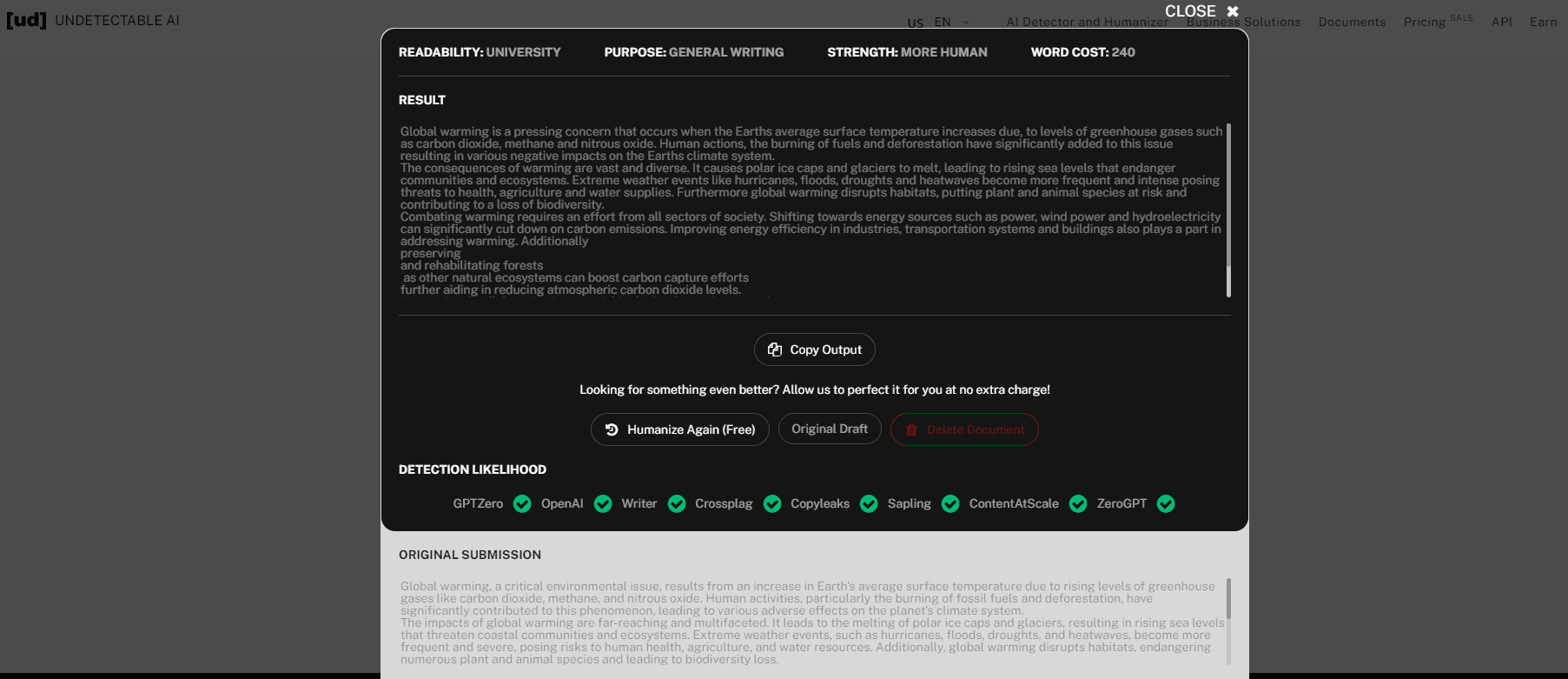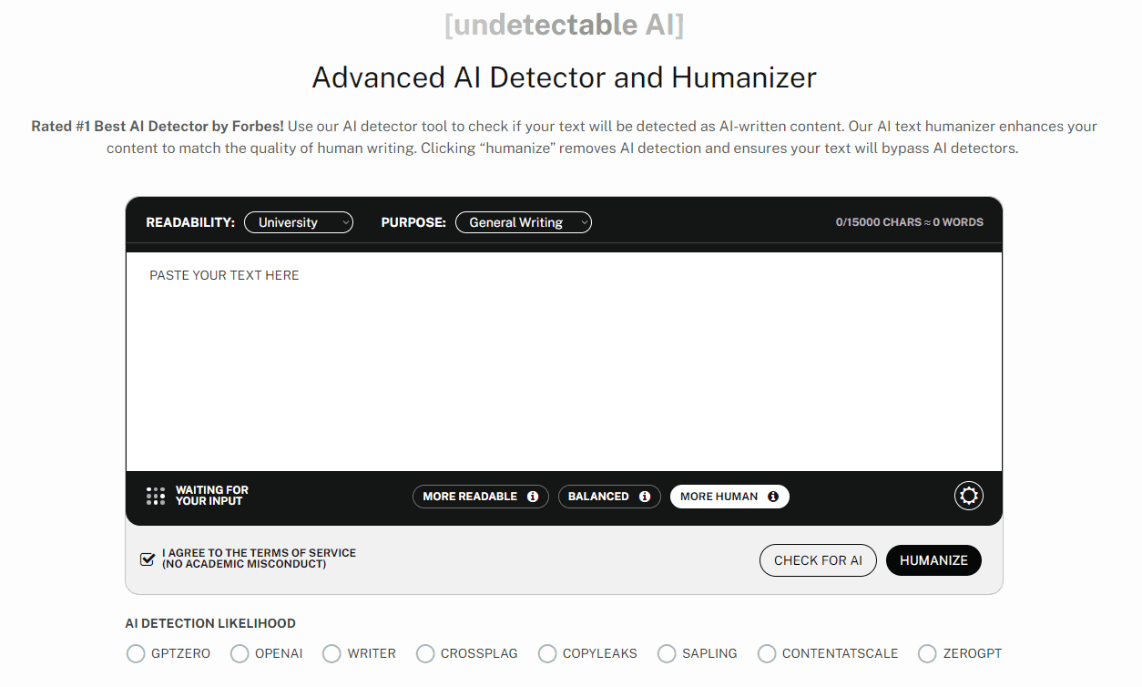 Undetectable AI provides an array of vocal styles to match the tone and purpose of the intended audience and content, spanning from scholarly to informal and approachable tones. The content produced is not just grammatically accurate but also carries a genuine human-like quality, making it more engaging and relatable for the audience.Undetectable AI serves as an all-encompassing platform, blending detection and content rewriting features. This cohesive approach streamlines the process, ensuring uniform quality while offering an easy-to-navigate interface suitable for users of all technological proficiencies. With a simple copy-and-paste action, followed by a quick detection and potential humanization process, users can refine their content effortlessly in just a few steps.However, Undetectable.ai has its own set of challenges. There are instances where the output might present syntactic or grammatical inaccuracies that necessitate human correction. Additionally, the current design of the text editor may remove certain formatting details, posing potential issues for those who require particular formatting styles in their documents.