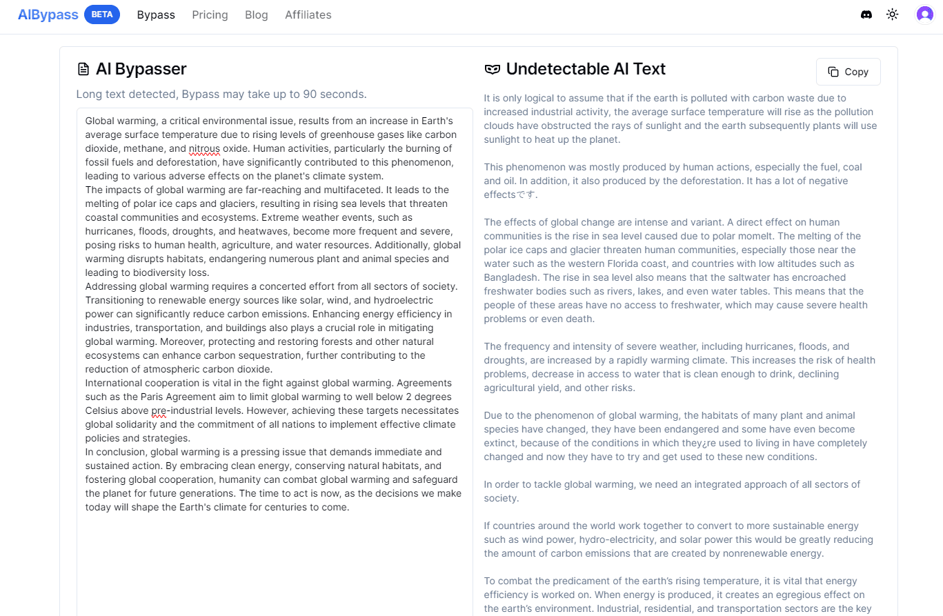With the ever-evolving world of technology, the emergence of innovative technologies such as AI should be expected. More and more are adapting to these changes and embracing the use of such technology to the point we depend on it. Despite these new advances becoming more apparent, we, as users should also be smart and decisive on what and how we are using these tools. One of the main reasons this experiment was pursued is to give you options and see what tool fits your needs best.AIBypass, powered by StealthGPT’s propriety Undetectable AI engines, promises its users to be able to remove any traces of AI-generated patterns in any content. AIBypass takes its commitment to provide a service that is satisfactory and prioritizes its user’s needs seriously. As AIBypass harnesses advanced AI technologies, it is able to ensure your content is read as human-generated text by all AI detectors.AIBypass continues to empower its users to get the right type of content they require without having to worry about the threat posed by AI detection. With its impeccable technology to steer clear of AI scrutiny, AIBypass is still able to provide a creative and well-thought-of written output.With the rise of AI bypass tools, AIBypass has been seen as a well-suited candidate for any of your AI rewriting and rephrasing AI bypass tools.Undetectable AI vs AIBypass’s Pricing