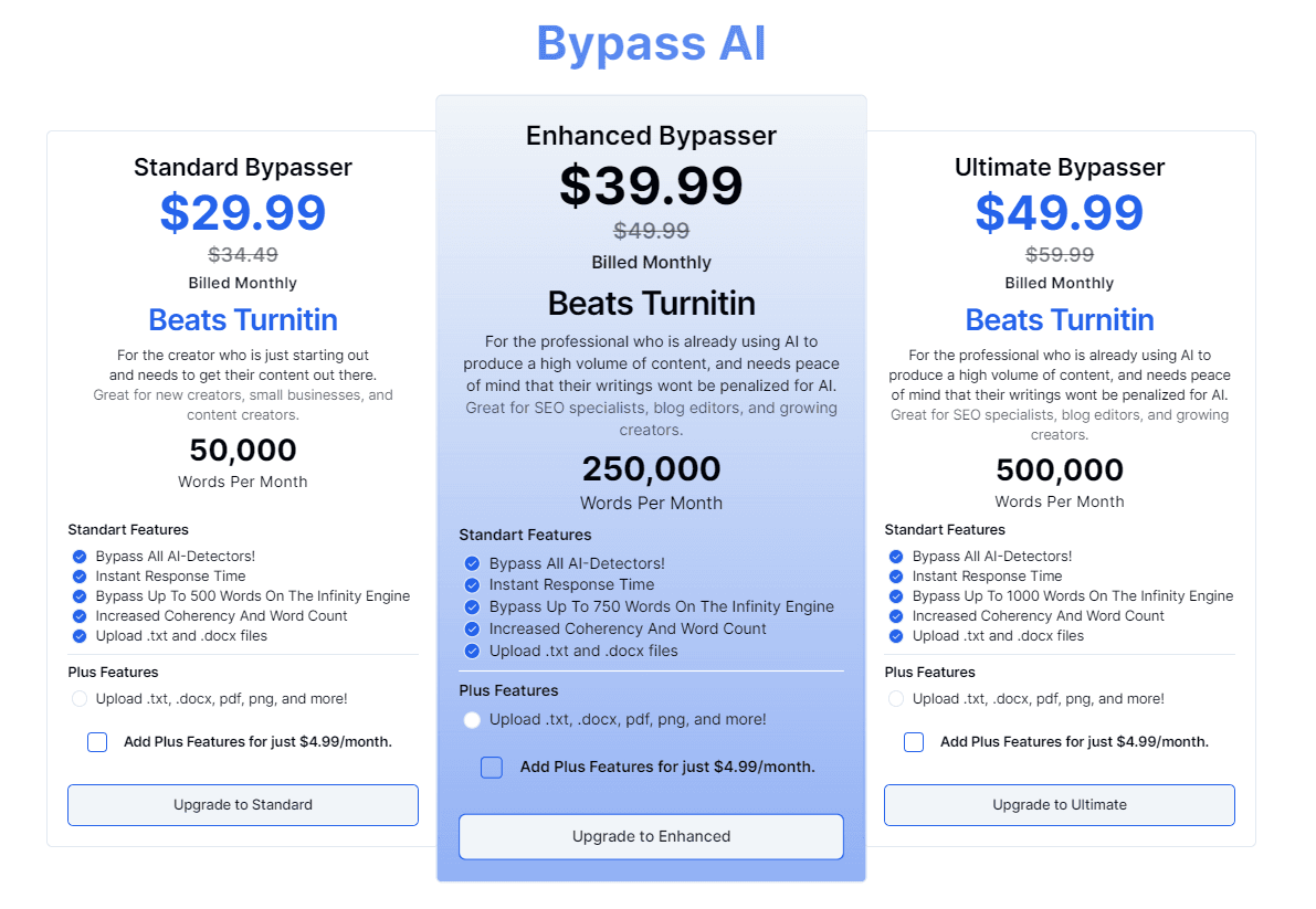 AIBypass offers users different comprehensive subscriptions. Starting with the Standard Bypasser for only $29.99, you already get 50,000 words rewritten per month, which ensures to bypass all AI detectors, bypass up to 500 words on the Infinity Engine, and more. This is perfect for new content creators and small businesses who need their content out on the web. With AIBypass’ Enhanced Bypasser for $39.99, you get to have 250,000 words per month, bypass all AI detectors, increased 750 words on the Infinity Engine, and more. With one of the most popular subscriptions in this platform, professionals who are already utilizing AI technology get the most out of this package which is perfect for SEO, blogs, and growing your community with good content. Lastly, AIBypass offers the Ultimate Bypasser at $49.99 as its most premium subscription. With a whopping 500,000 rewritten undetected AI words per month, bypass up to 1,000 words on the Infinity Edge, bypass all AI detectors, and more.