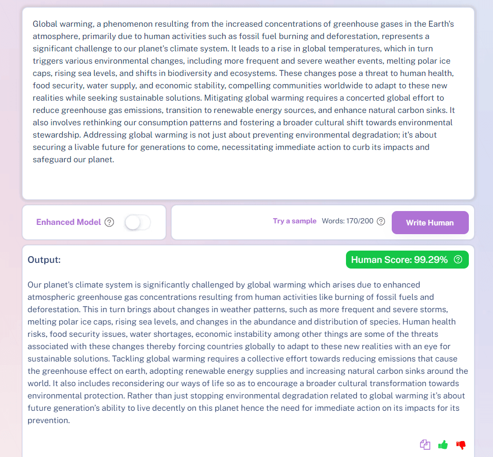 In our rapidly advancing technological landscape, the rise of artificial intelligence (AI) is inevitable, with many people increasingly relying on such innovations. As these technological advances become more integrated into our lives, it's crucial for users to use these tools wisely and make informed decisions about their applications. The motivation behind conducting this experiment was to offer alternatives and help you determine which tool best suits your specific needs.AIBypass has proven its exceptional capability in humanizing AI-generated content, achieving a remarkable 100% human-written score when evaluated by GPTZero. This unparalleled performance underscores AIBypass's sophisticated algorithms and their effectiveness in refining content to a level indistinguishable from genuine human output, setting a new benchmark for tools in this space. In comparison, WriteHuman's 73% score, while commendable, highlights AIBypass's superior ability to navigate and bypass AI detection systems. This makes AIBypass an ideal solution for individuals seeking to ensure their content remains authentic and undetected, catering to a wide range of needs from academic writing to professional documentation, thereby affirming its position as a top choice for enhancing the human quality of AI-generated text.AIBypass ensures its users can obtain their desired content type without the fear of AI detection systems. Leveraging state-of-the-art technology to evade AI monitoring, AIBypass not only bypasses detection with ease but also delivers content that is creative and meticulously crafted, maintaining the essence of authentic human writing.WriteHuman vs AIBypass’s Pricing