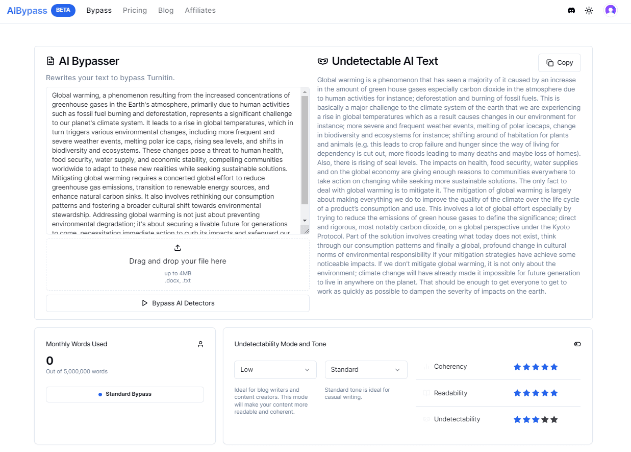 AIBypass is a platform designed to rephrase and rewrite AI-generated content to bypass AI detection tools like Turnitin and GPTZero. Powered by StealthGPT's Undetectable AI engines, it specializes in making content appear human-like, ensuring it passes through detection systems undetected. This efficiency in rewriting and rephrasing content, combined with its capability to consistently defeat major AI detectors, positions AIBypass as a powerful tool for users needing to ensure their content remains untraceable by AI tracking technologies.AIBypass boasts a highly effective engine that ensures your text evades detection by leading AI detectors such as GPTZero, Originality, and Copyleaks. Through our Undetectable AI Humanizer, we meticulously rewrite your content to exhibit a distinctly human-like quality, enhancing its naturalness and authenticity.