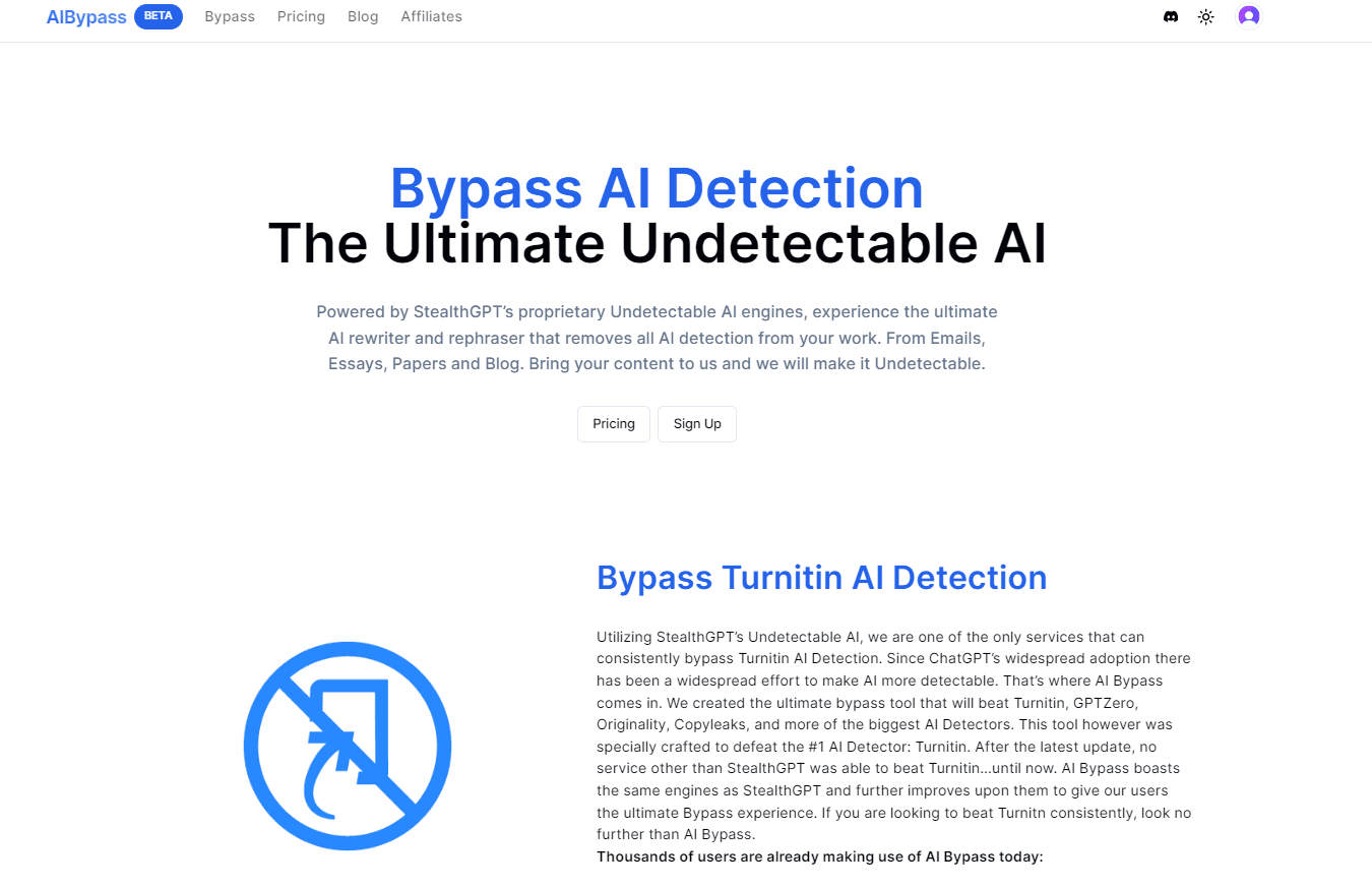 Unique AI Evasion Capabilities: AIBypass stands out with StealthGPT's unique AI engines, outperforming conventional rewriting services by erasing signs of AI creation, offering an unmatched solution for creators.Enhanced Content Refinement: Upon receiving content, AIBypass employs its robust AI for a complete overhaul, ensuring modifications in sentence structure, vocabulary, and phrasing make the content AI-detector resistant while preserving the original message's essence.Contextual Understanding Excellence: Moving beyond mere word substitution, AIBypass's algorithms adeptly grasp content context, ensuring modifications evade AI detection and remain faithful to the original intent.Assured Stealth: AIBypass guarantees content modified on its platform will bypass AI scrutiny, serving a range of purposes from scholarly articles to professional and creative writing, seamlessly blending with the creator's style.Seamless Creative Workflow Integration: AIBypass simplifies integration into existing content creation processes, allowing creators to focus on innovation without the concern of AI detection, supporting a smooth content generation experience.Review and Adjustment: AIBypass provides a preview feature for creators to review and ensure the content's core remains intact, offering the freedom to make final adjustments as needed.AIBypass stands as a pioneering solution in the realm of content creation, tackling the issue of AI detection with a forward-thinking strategy. By removing AI signatures from content, it seamlessly melds into the creative workflow, enabling creators to craft authentic, undetectable works with confidence.Test Preparation