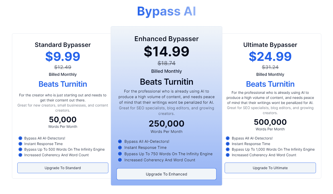 AIBypass offers users different comprehensive subscriptions. Starting with the Standard Bypasser for only $29.99, you already get 50,000 words rewritten per month, which ensures to bypass all AI detectors, bypass up to 500 words on the Infinity Engine, and more. This is perfect for new content creators and small businesses who need their content out on the web. With AIBypass’ Enhanced Bypasser for $39.99, you get to have 250,000 words per month, bypass all AI detectors, increased 750 words on the Infinity Engine, and more. With one of the most popular subscriptions in this platform, professionals who are already utilizing AI technology get the most out of this package which is perfect for SEO, blogs, and growing your community with good content. Lastly, AIBypass offers the Ultimate Bypasser at $49.99 as its most premium subscription. With a whopping 500,000 rewritten undetected AI words per month, bypass up to 1,000 words on the Infinity Edge, bypass all AI detectors, and more.