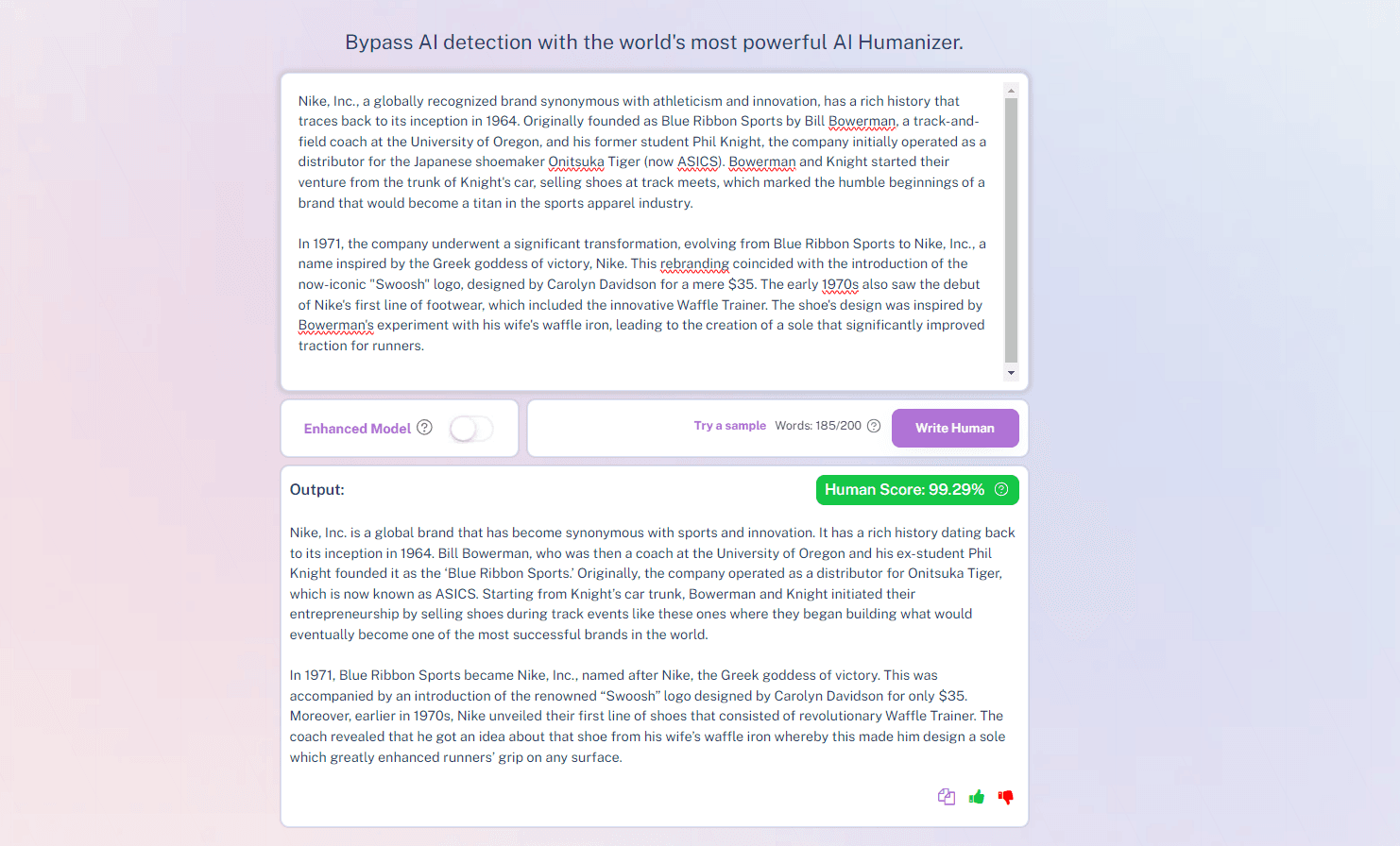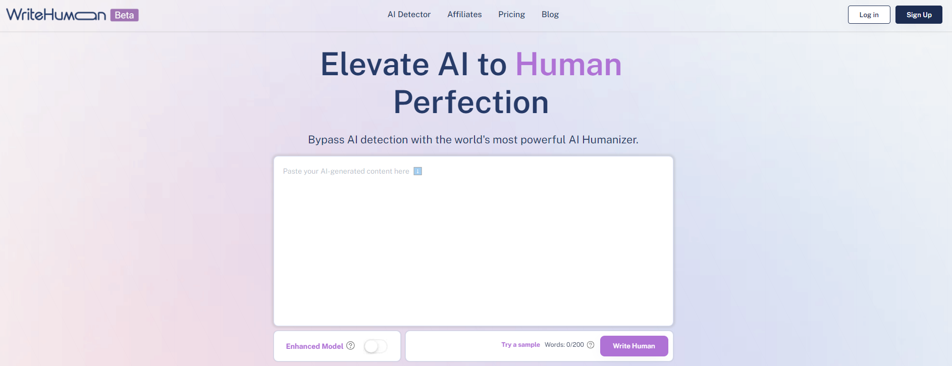 Undetectable AI websites are sophisticated online platforms that harness advanced artificial intelligence to produce content, services, or interactions that are indistinguishable from those created by humans. These platforms utilize cutting-edge AI technologies, such as natural language processing and machine learning, to generate text, images, videos, or even complex interactions that are convincingly human-like. The advanced capabilities of these AI systems often leave users unable to determine whether the content or interactions they experience are the work of algorithms or real people. This high level of AI integration is prevalent across various sectors, including journalism, creative writing, customer support through chatbots, and interactive entertainment.Undetectable AI websites contribute significantly to improving our online experiences by delivering convenience, efficiency, and personalized engagement. AI-enhanced customer support chatbots, for example, provide immediate answers to user questions any time of the day or night, markedly reducing waiting periods and boosting user contentment. Similarly, AI-driven content recommendation engines fine-tune our online journeys by analyzing our browsing behaviors and suggesting articles, products, or entertainment that suits our preferences. Furthermore, AI-powered tools for content creation offer assistance in swiftly producing a wide range of written materials, from corporate documents to imaginative fiction, meeting the demand for fast, effective, and superior content creation. These AI technologies operate discreetly, enriching online interactions and making them more fluid and captivating, thereby subtly enhancing both efficiency and customization without sacrificing the human element.What is WriteHuman?
