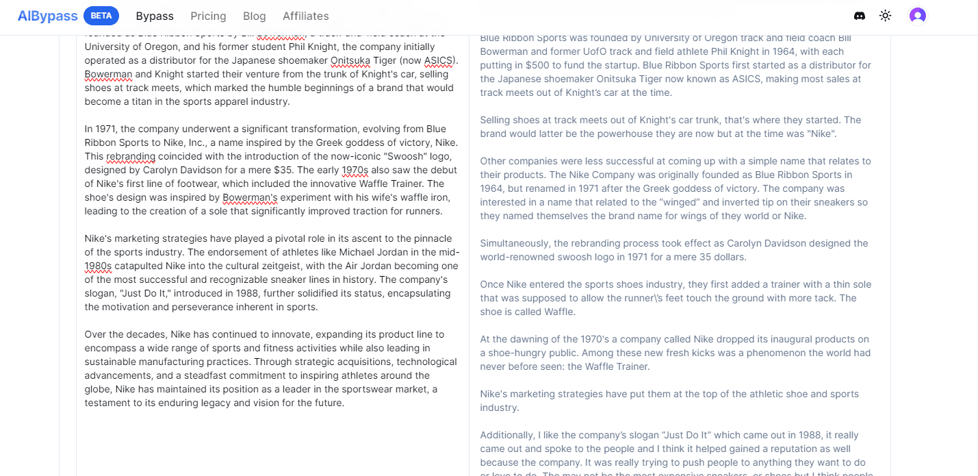 In an evaluation of WriteHuman's capability to disguise AI-generated content, we tested its output using Originality AI, a detection tool for identifying AI-produced text. The goal was to see if WriteHuman could alter content enough to make it seem human-written. However, the test results were clear: Originality AI scored the content as 100% AI-written, indicating that WriteHuman did not succeed in bypassing the detection algorithm. This outcome points to a significant shortfall in WriteHuman's ability to fool advanced AI detection systems.The result of this test is important for those using AI to produce content intended to pass as human-authored, particularly in situations where authenticity matters. WriteHuman's inability to evade Originality AI's scrutiny raises doubts about its utility for anyone needing their content to appear human-made. This underscores the challenges AI content generators face in mimicking human writing to a degree that remains undetected by the latest AI discernment technologies, highlighting the need for ongoing improvements in AI writing tools.Let’s put AIBypass to the same test.