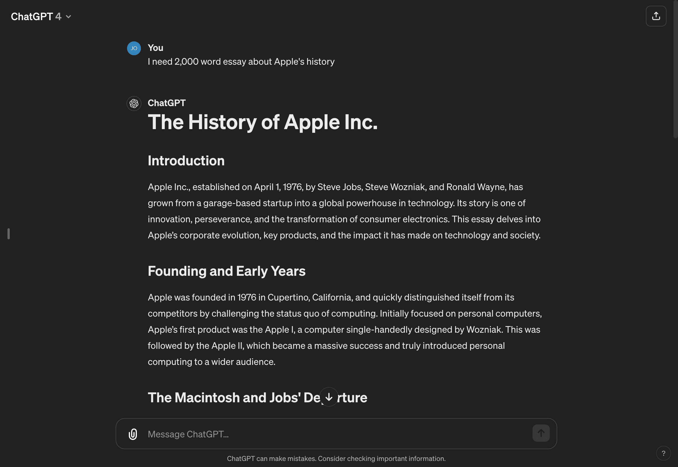 Open any AI content writing tool you enjoy using. Input a prompt describing the content that you want it to create for you. For the purpose of this guide, we'll ask ChatGPT 4 to write a 2000-word essay about Apple's history.