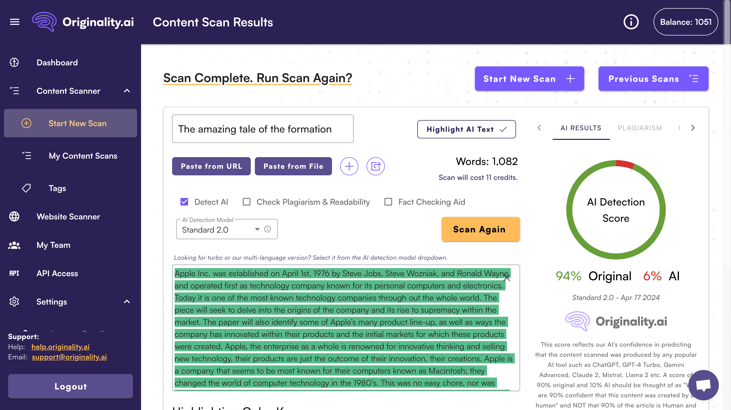 We've told you the answer to this question already. Now, it's time to show you the answer. We'll tell two popular AI content detection tools, Originality.ai and GPT Zero, to scan the text humanized by AI Bypass.When Originality.ai scanned the text humanized by AI Bypass, it couldn't detect that the text has been paraphrased with an AI tool. It only observed that there was a 94% chance that the text was written by a human, and a 6% chance that it wasn't. That's a massive win! Here's a screenshot of the scan results: