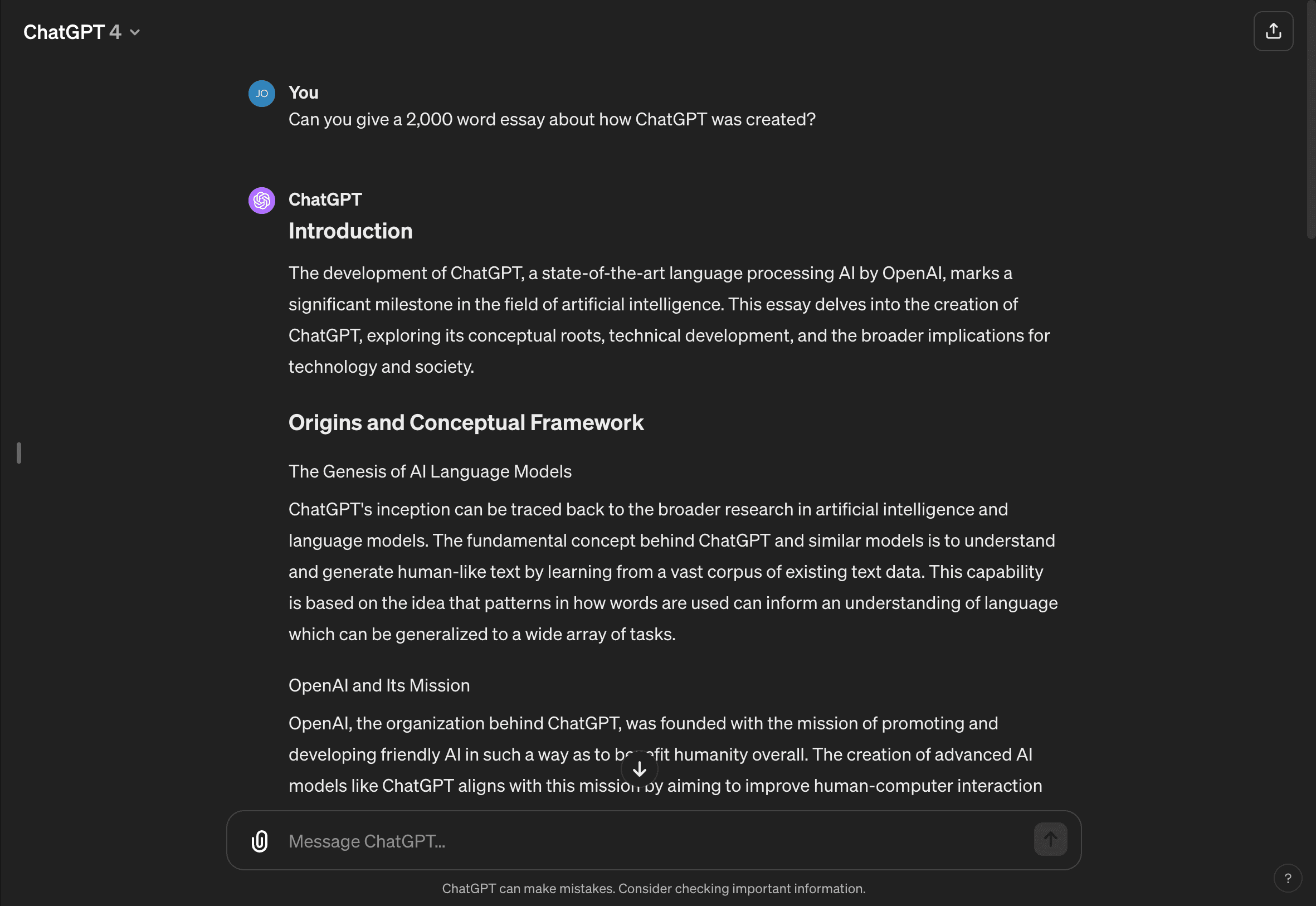 The first step is to create some content with any AI tool that you have access to. It could be ChatGPT, Copy.ai, Jasper, or any other software. Use any prompt you want. For the purpose of this article, we'll use ChatGPT to create an essay on how ChatGPT was created.