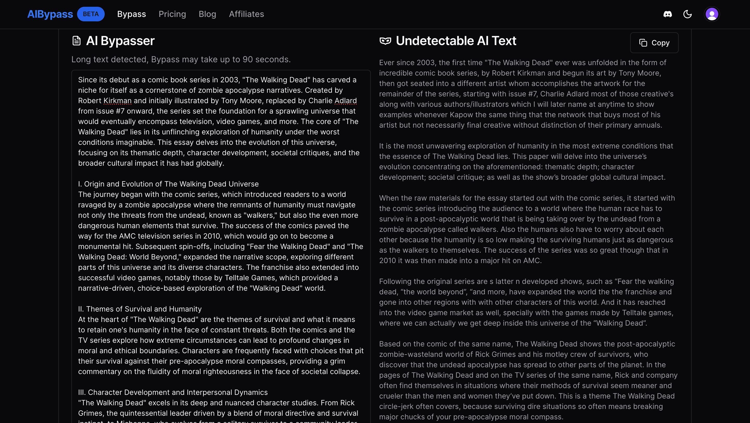 Finally, let's click "Bypass AI Detectors." It's that simple. We'll copy the newly written content and place them against GPTZero and Originality to see how well it does.