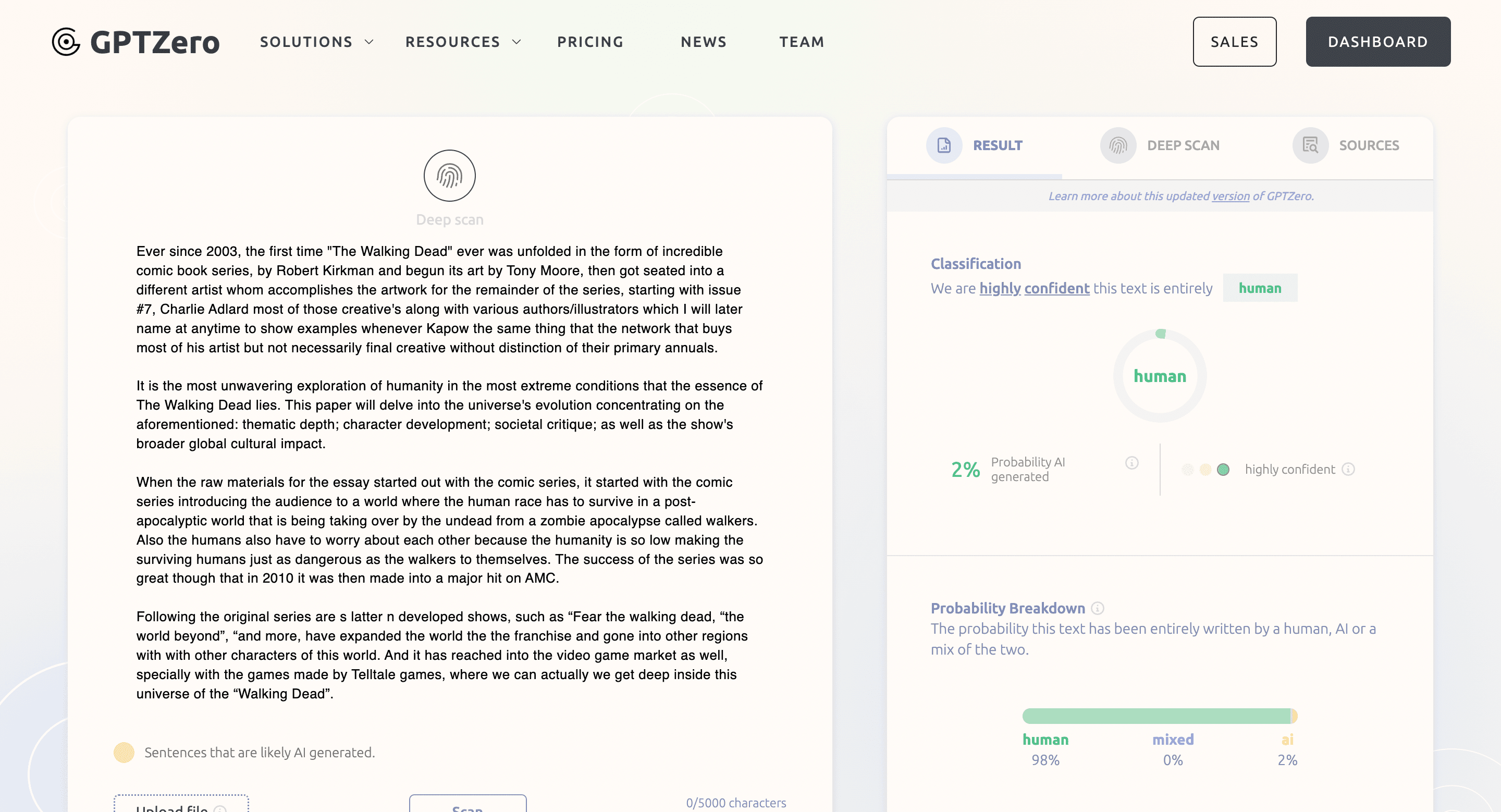 Human written. That's all we needed to hear. 2% AI written content is an amazing result that shows just how powerful AI Bypass is. We can safely say that AI Bypass can surpass GPTZero. Let's see how well AI Bypass is against Originality next.