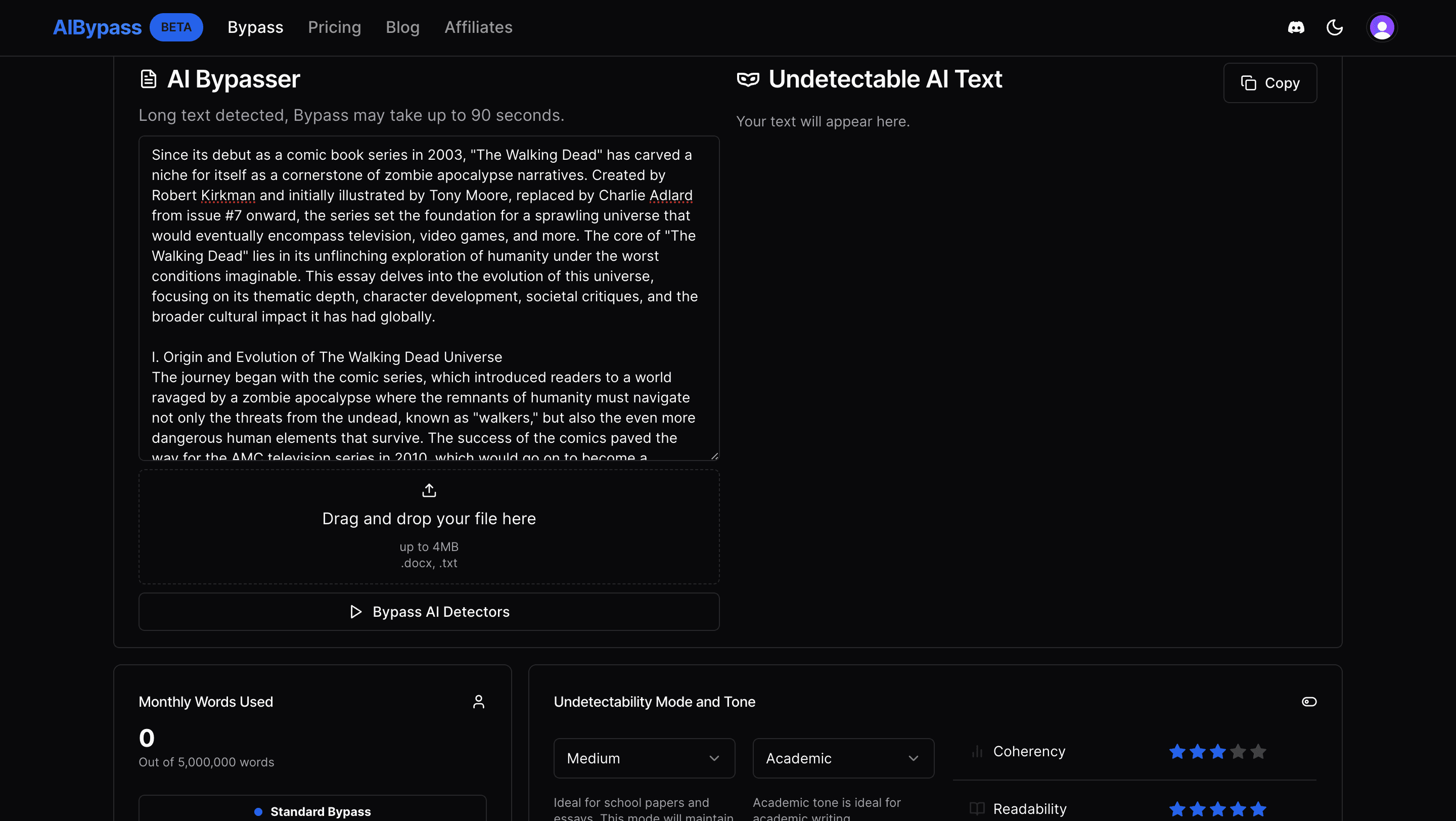 Let's put the prompt into AI Bypass' website and select medium undetectability mode and academic tone.
