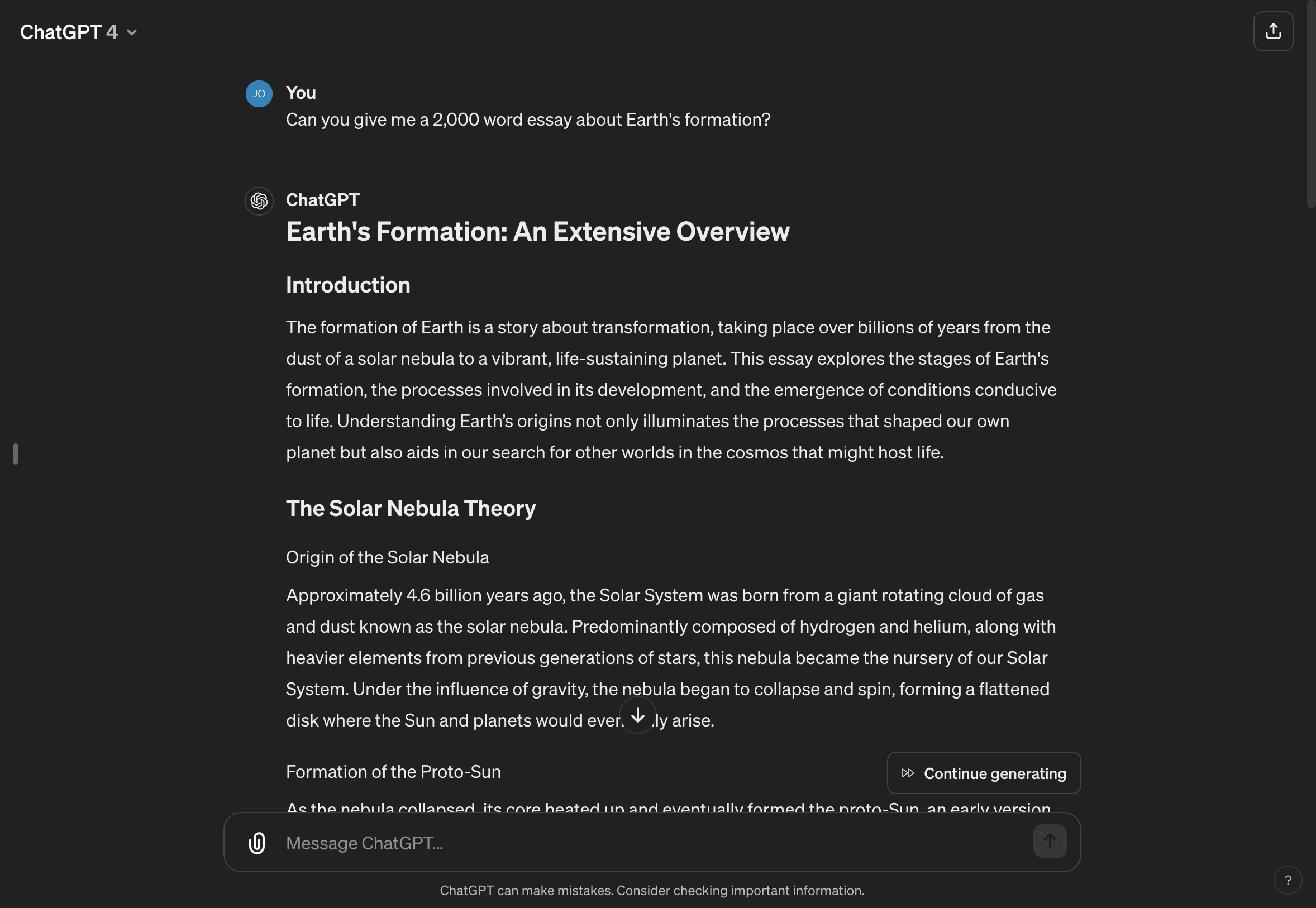 Open any AI writing tool and send it a prompt. You can make your prompt as short or long as you want. We're keeping things simple, so we'll ask ChatGPT to give us a 2000-word essay about the Earth's formation.