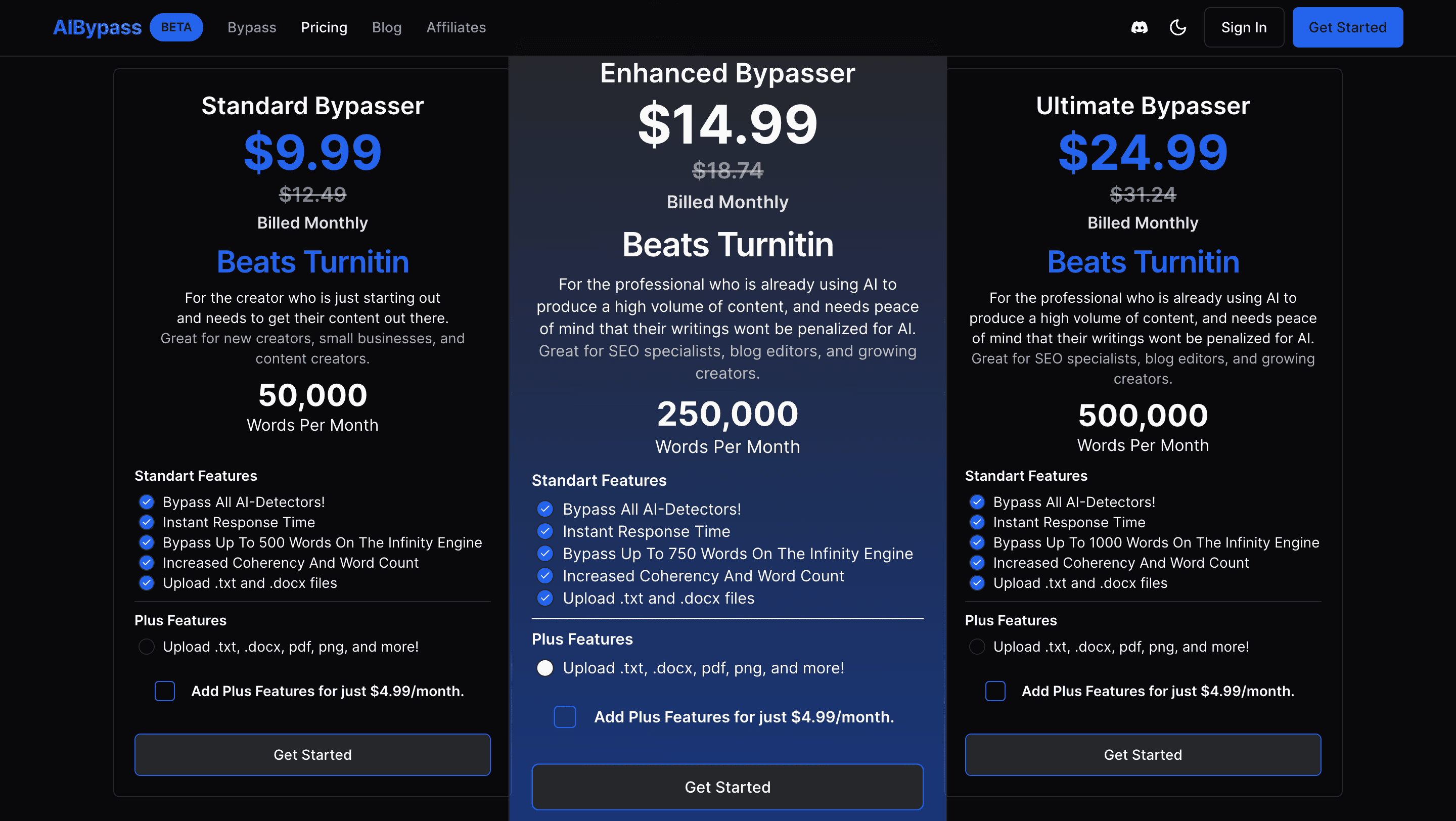 - Enhanced Bypasser: This subscription plan is priced at $14.99 per month. On it, you can humanize 250,000 words every month with AI Bypass.