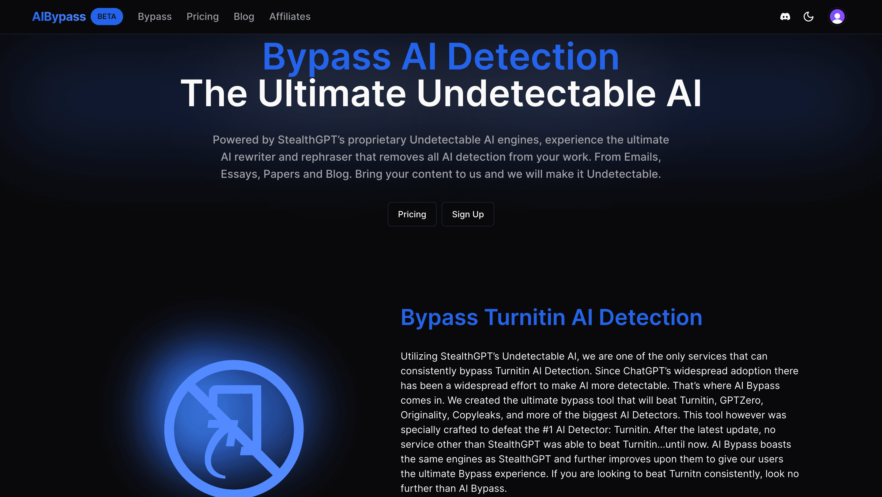 AI Bypass is a paraphrasing software that helps to humanize ChatGPT writing and content generated by any AI tool within seconds. It's built on the engine of StealthGPT, which is the only artificial intelligence program that can paraphrase any AI-written content so that it bypasses AI detection. Once you've created content with AI and you want to humanize it, just run it through AI Bypass. You won't need to do anything else to avoid AI checkers.