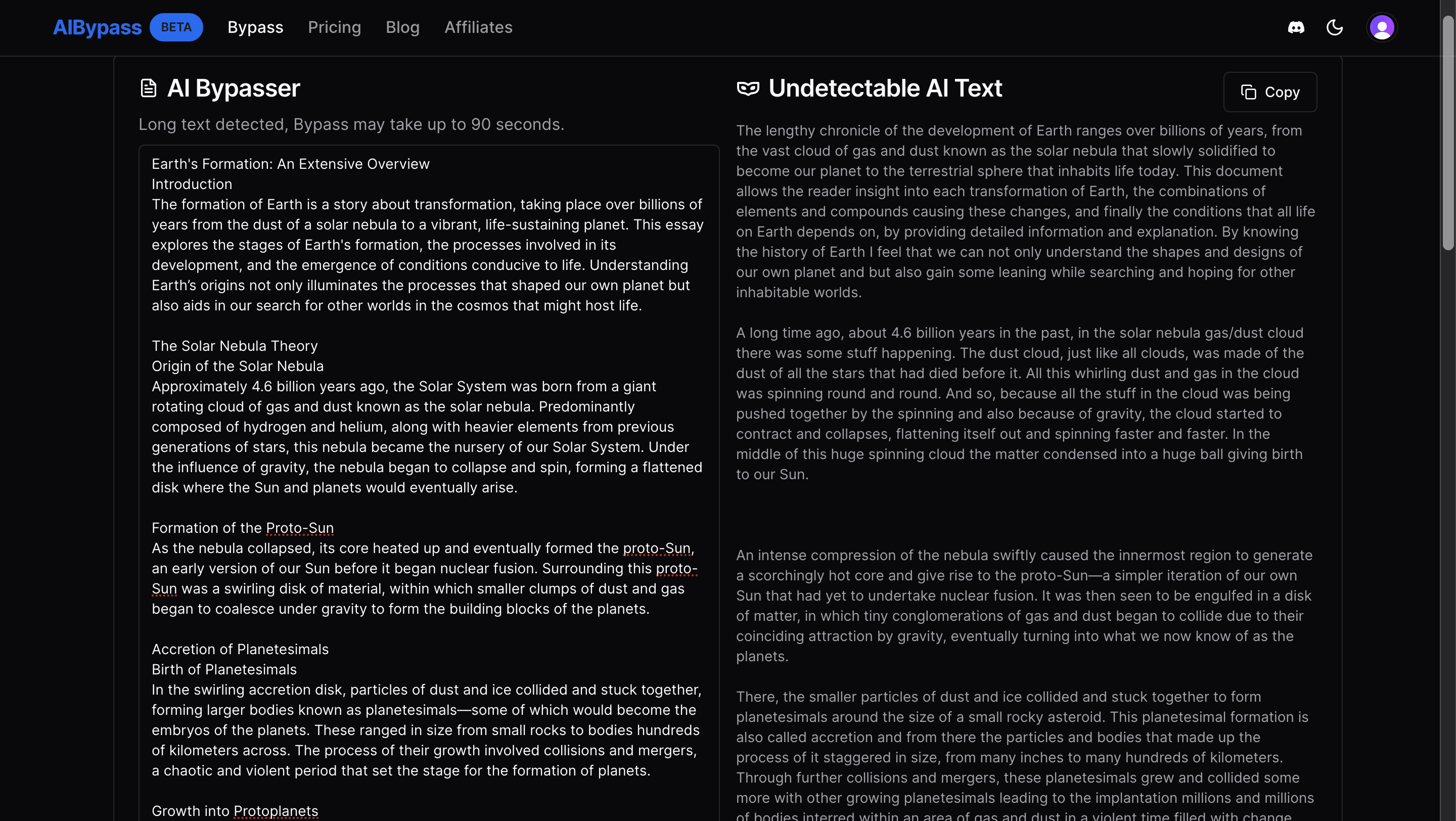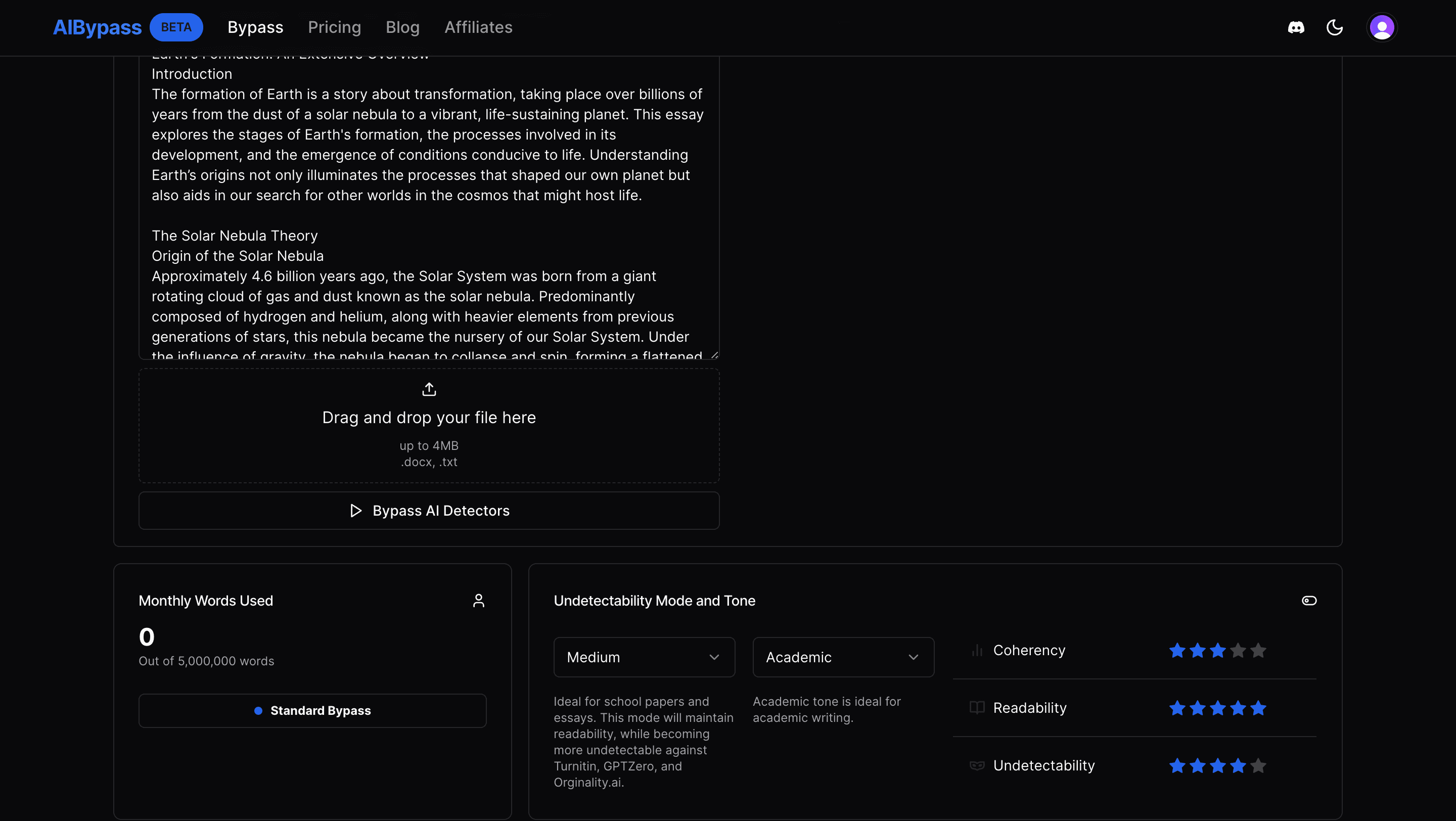 Click “Bypass AI Detectors.” AI Bypass will immediately start to paraphrase the content. You can view the results on the right side of your AI Bypass workspace.